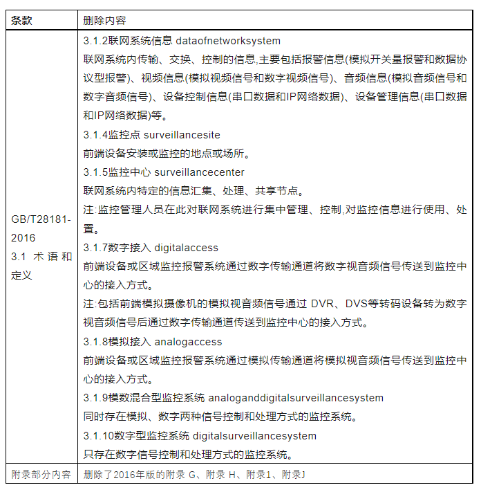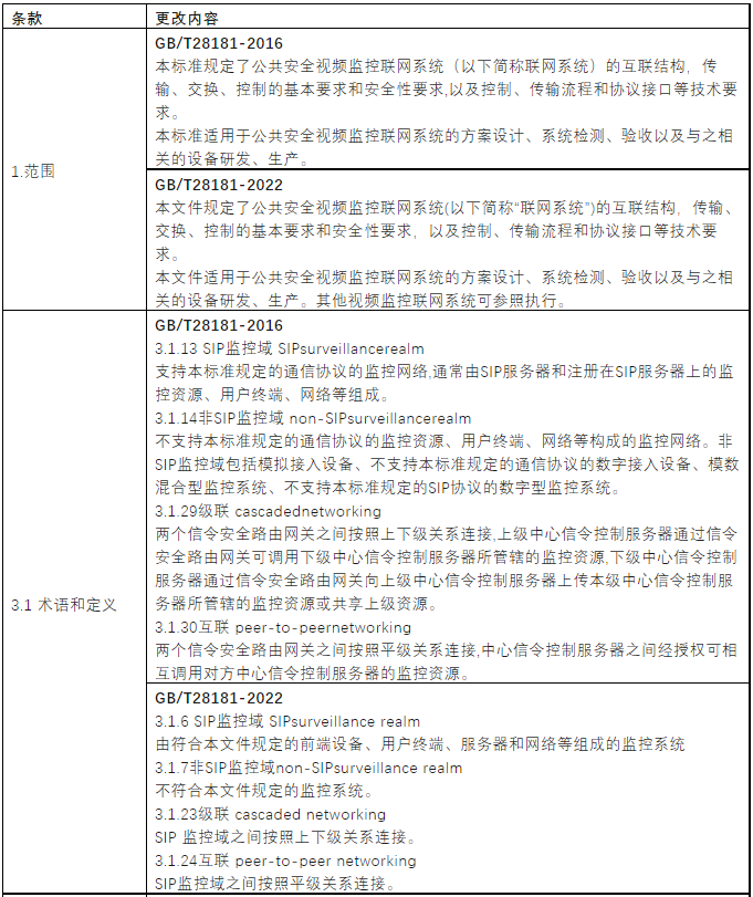 本篇内容根据GB/T28181-2022《公共安全视频监控联网系统信息传输、交换、控制技术要求》【前言】部分列举的修订部分进行整理,分为【删除修订内容】、【增加修订内容】、【更改修订内容】三部分进行展示(文中涉及“命令”、“参数”等内容,不做详细列举,具体请参见标准原文),方便行业同仁快速浏览、学习。