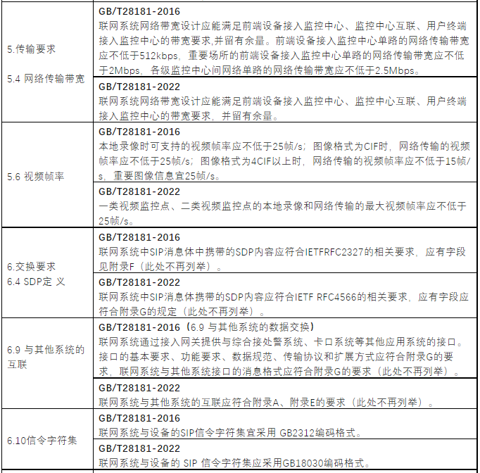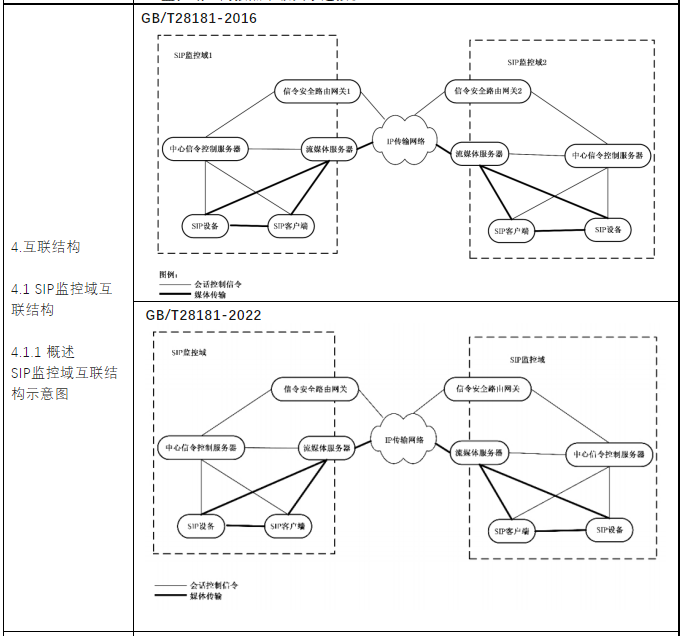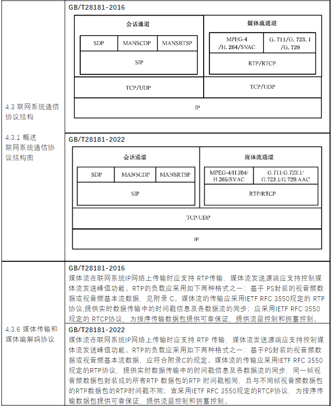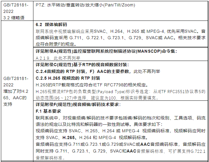 新版国家标准GB/T28181-2022《公共安全视频监控联网系统信息传输、交换、控制技术要求》代替了GB/T28181—2016《公共安全视频监控联网系统信息传输、交换、控制技术要求》,与GB/T28181—2016相比,除结构调整和编辑性改动外,相关主要技术有一些变化。例如更改了标准范围,删除了“联网系统信息”“数字接入”“模拟接入”“模数混合型监控系统”“数字型监控系统”“监控点”“监控中心”的术语和定义,更改了“SIP监控域”“非SIP监控域”“级联”“互联”的术语和定义,更改了“SIP监控域互联结构示意图”,更改了“联网系统通信协议结构图”,媒体流通道增加了H.265、G.722.1、AAC等等。